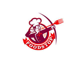 Foodstop餐飲店標(biāo)志設(shè)計(jì),融入廚師、刀叉元素,整體動(dòng)作呈射箭形狀,紅色是主色調(diào)。